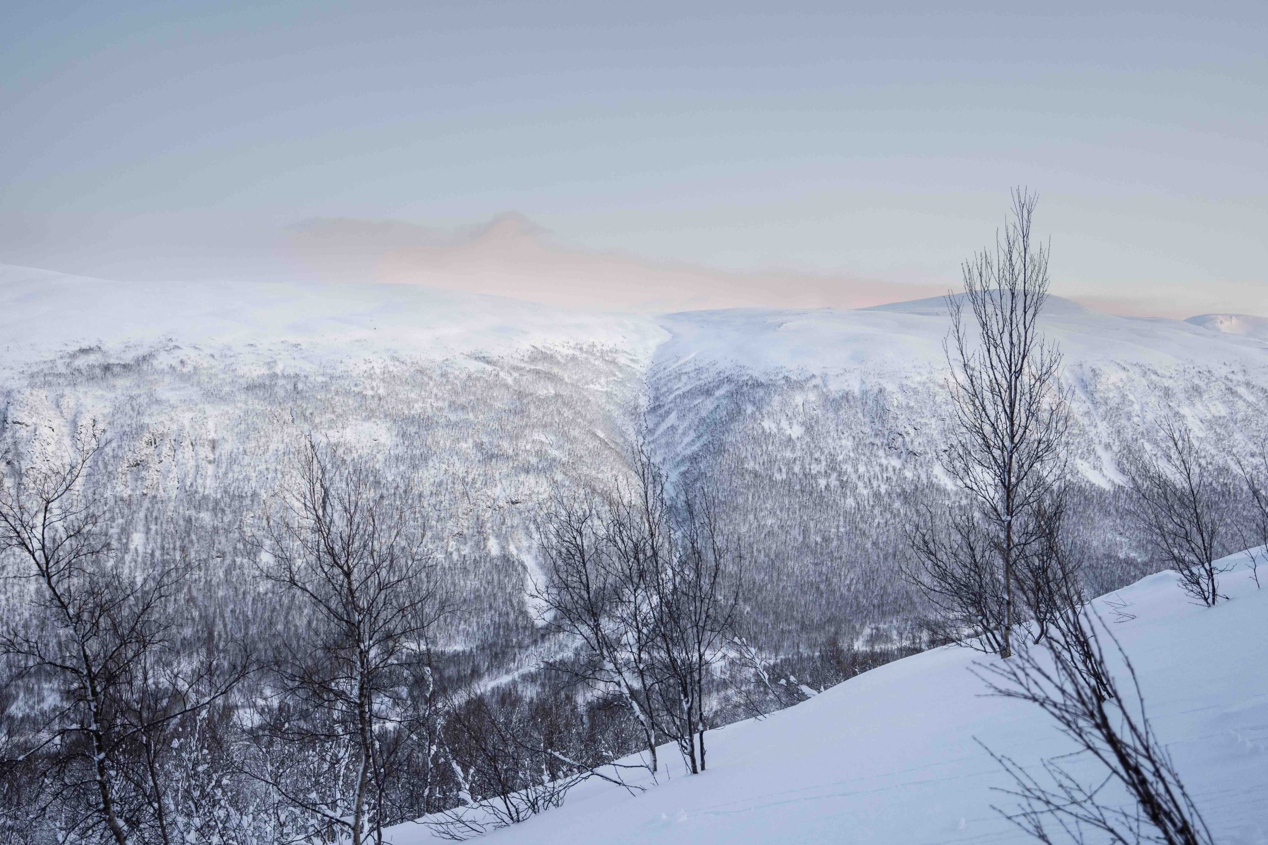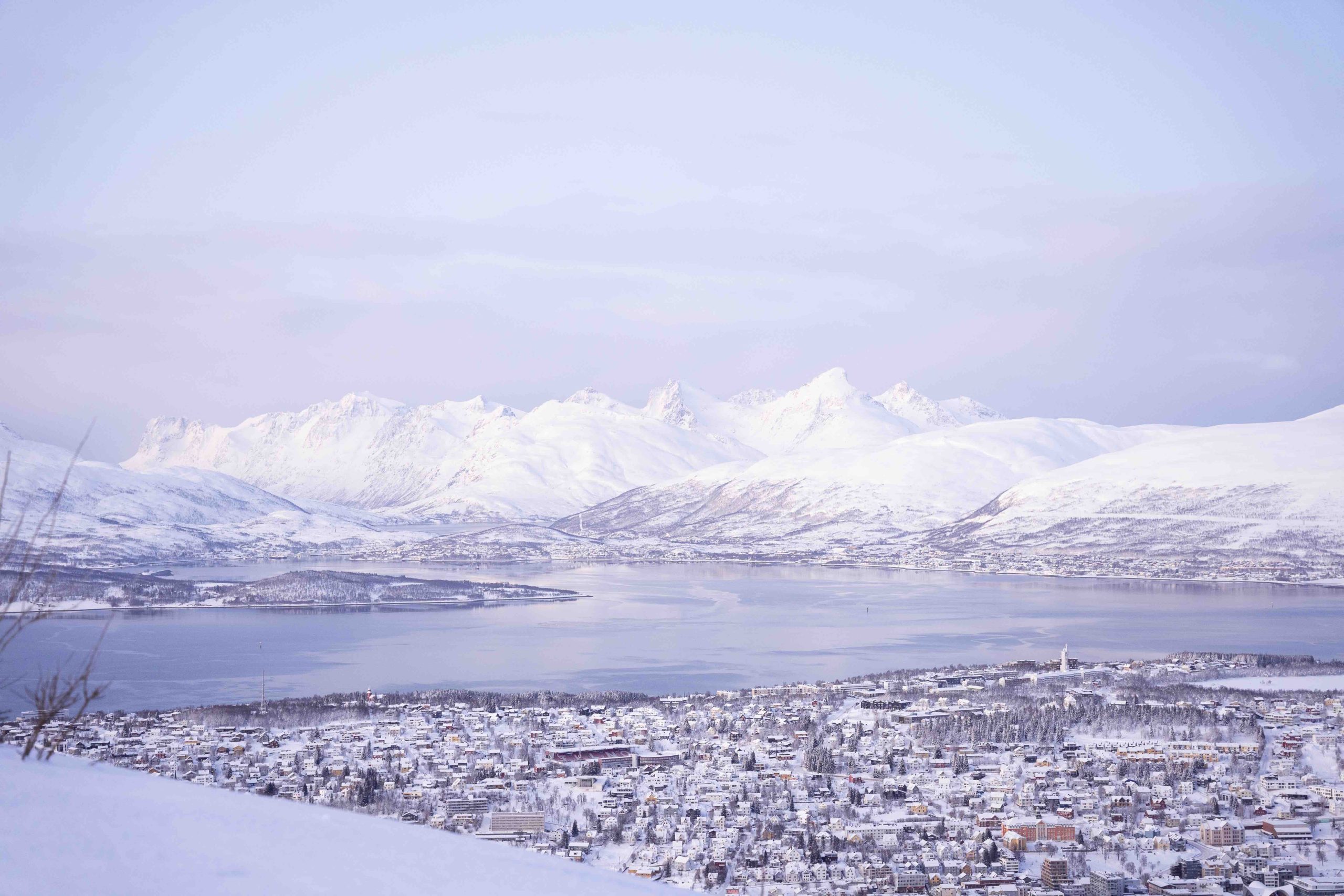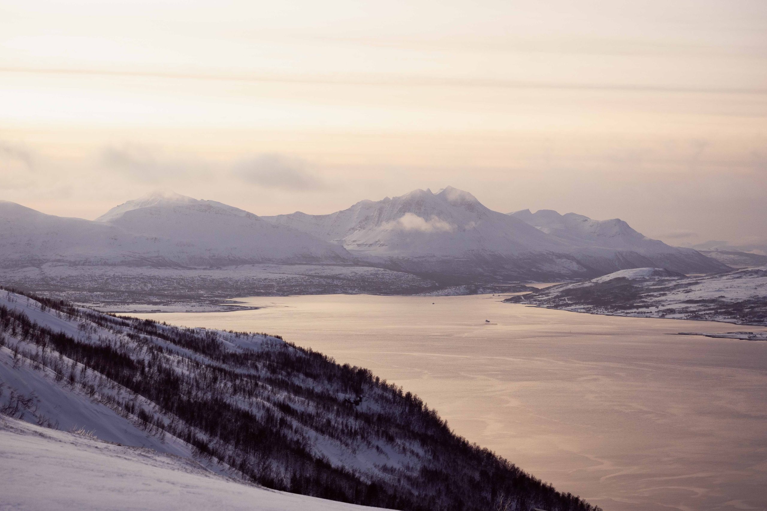 Mi amiga Jente y yo decidimos subir al Tromsø Viewpoint a pie, en lugar de usar el telefĂ©rico. La idea era magnĂfica, pero la ejecuciĂłn se nos complicĂł un poco, al estar todo completamente cubierto de nieve y tener que averiguar el sendero. Pero con unos crampones en las botas, mucha agua, y capas y capas de ropa tĂ©rmica conseguimos llegar a la cima. La subida realmente solo nos llevĂł una hora, y valiĂł absolutamente la pena por todos los paisajes por los que atravesamos. Los árboles nevados, las distintas tonalidades de blancos, el color rosado del cielo, y la luz dĂ©bil del mediodĂa creaban un escenario digno de cuento de Navidad.